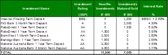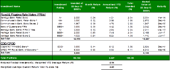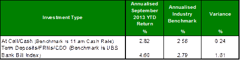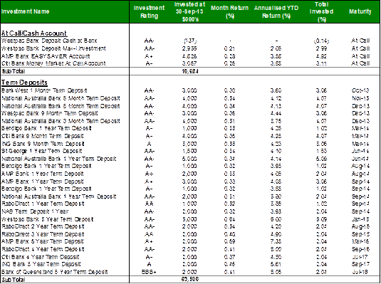 That the summary of investments performance for September 2013 be received and noted; and that the Certificate of the Responsible Accounting Officer be noted and report adopted.
