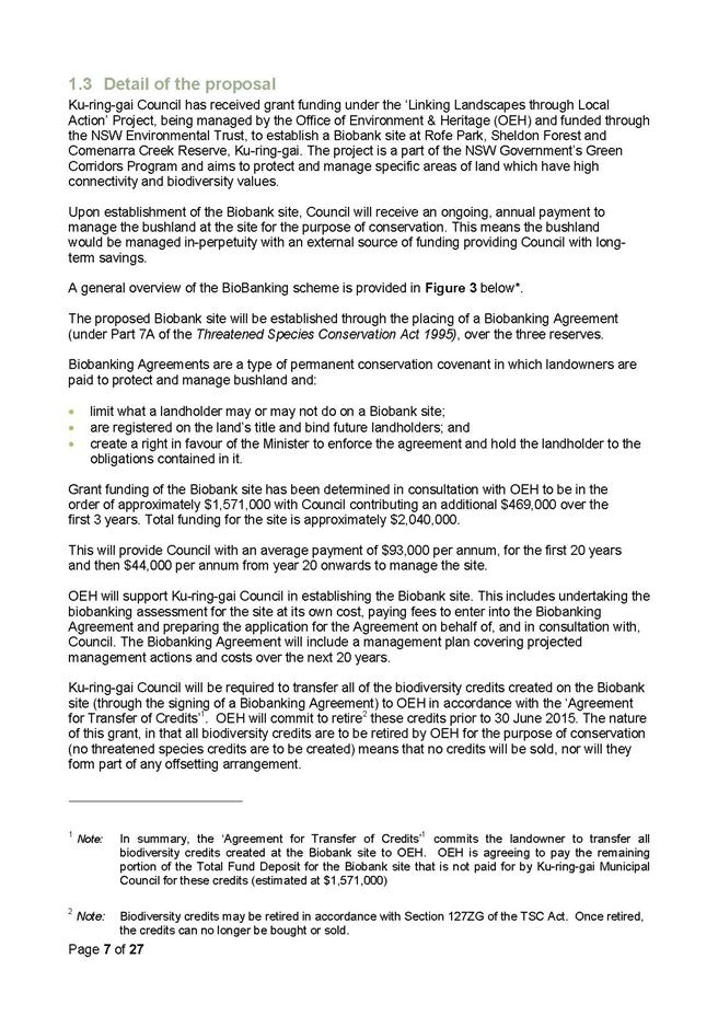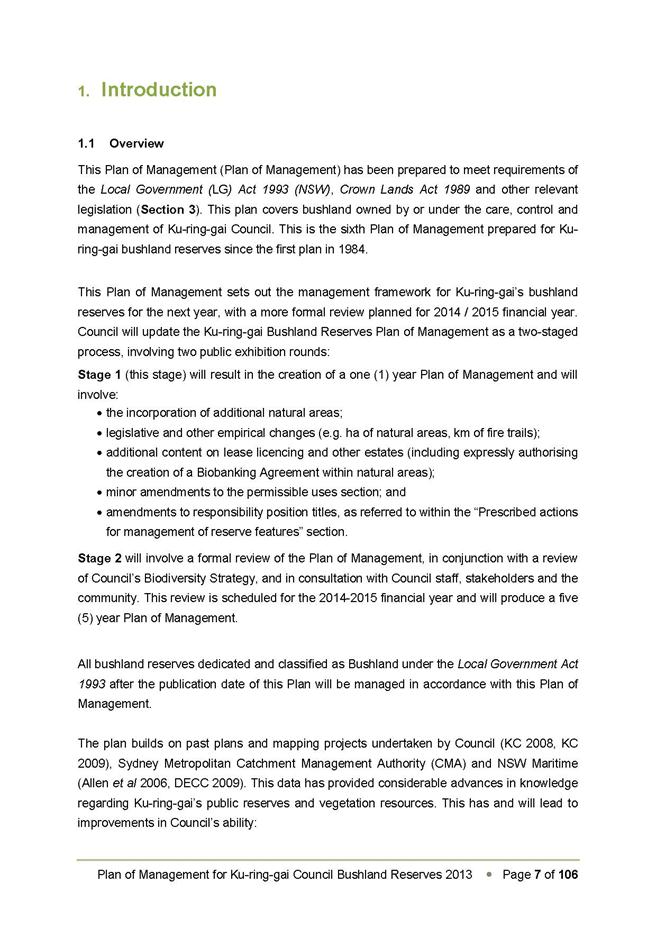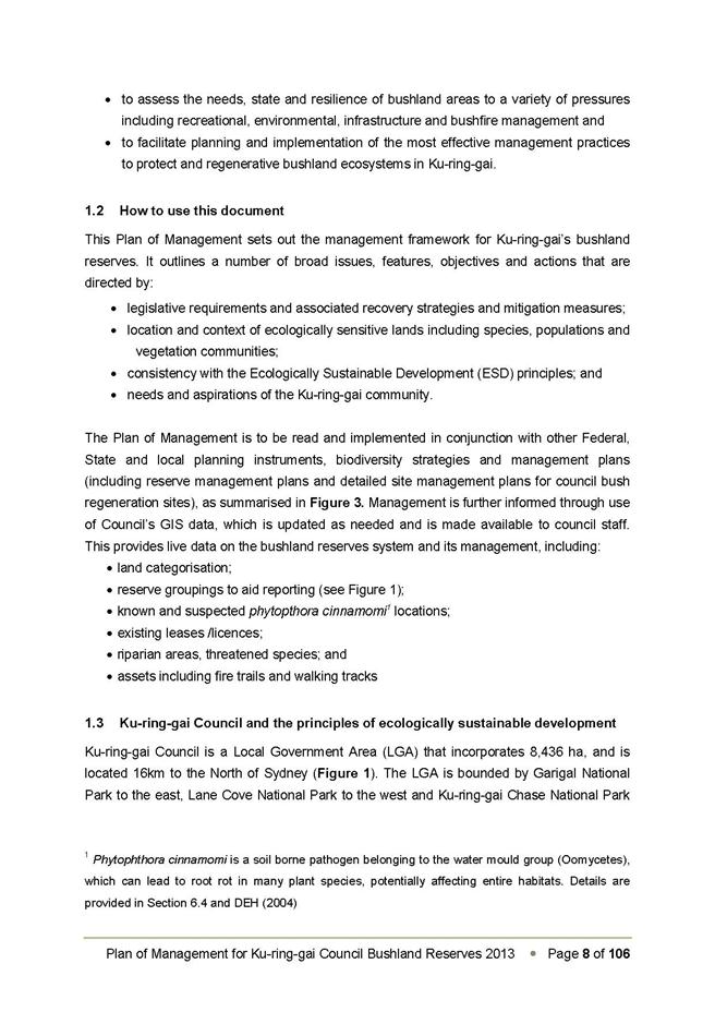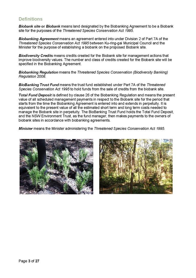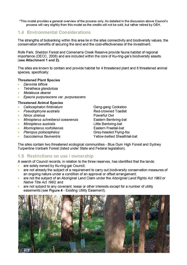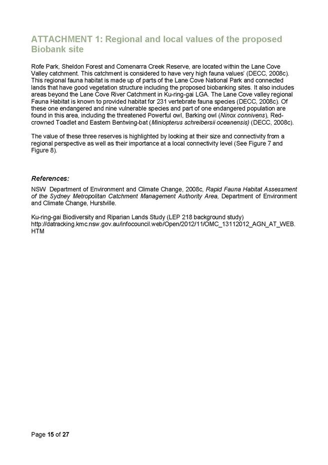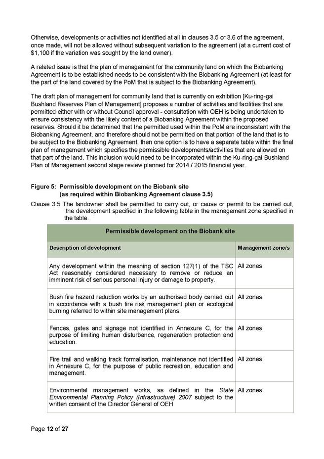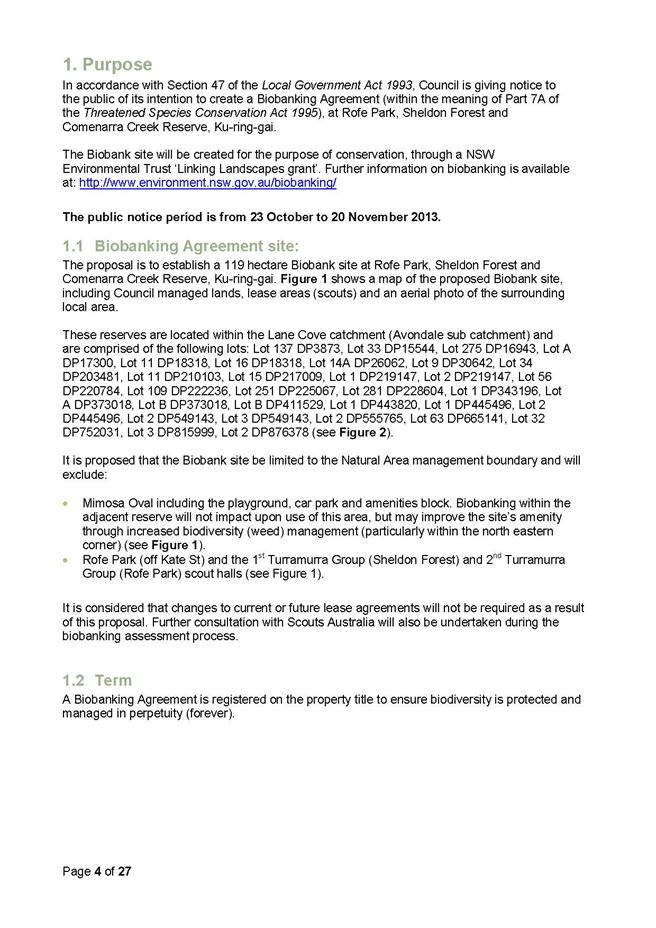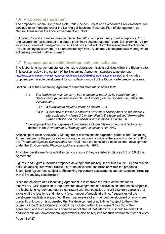 To seek Council’s endorsement to: (i) place the draft Ku-ring-gai Bushland Reserves Plan of Management (PoM) on public exhibition and conduct a public hearing, in accordance with the requirements of the Local Government Act 1993; and (ii) to exhibit notice of the proposal to create a Biobanking Agreement (within the meaning of Part 7A of the Threatened Species Conservation Act 1995), at Rofe Park, Sheldon Forest and Comenarra Creek Reserve, Ku-ring-gai, in accordance with the requirements of the Local Government Act 1993.