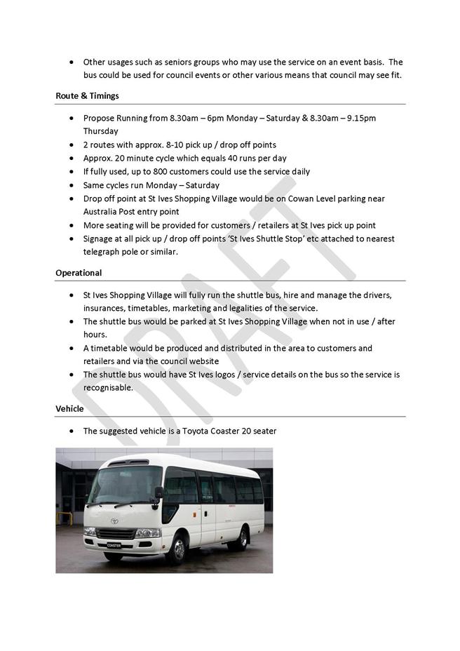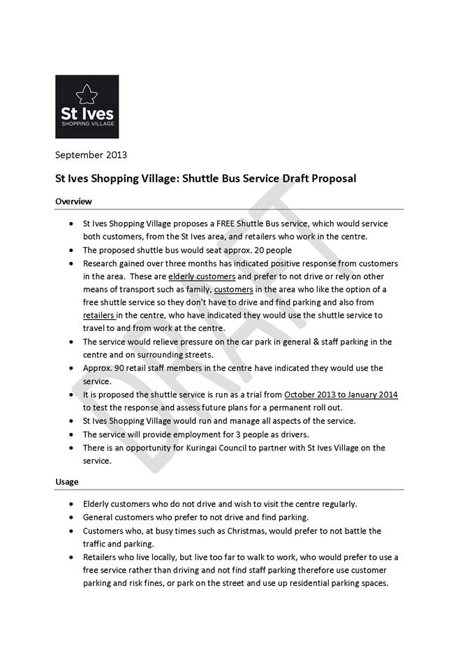 “1. That Council endorse in principle a St Ives shuttle bus service as outlined by the owners of the St Ives Shopping Village to council staff at its meeting on 30 September 2013.