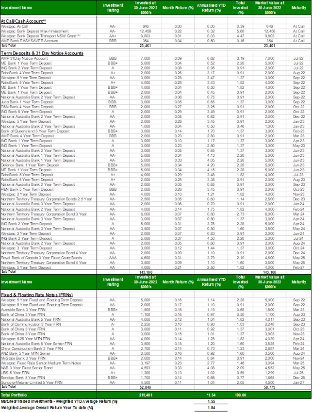 That the summary of investments performance for June 2022 be received and noted; and that the Certificate of the Responsible Accounting Officer be noted and the report adopted.