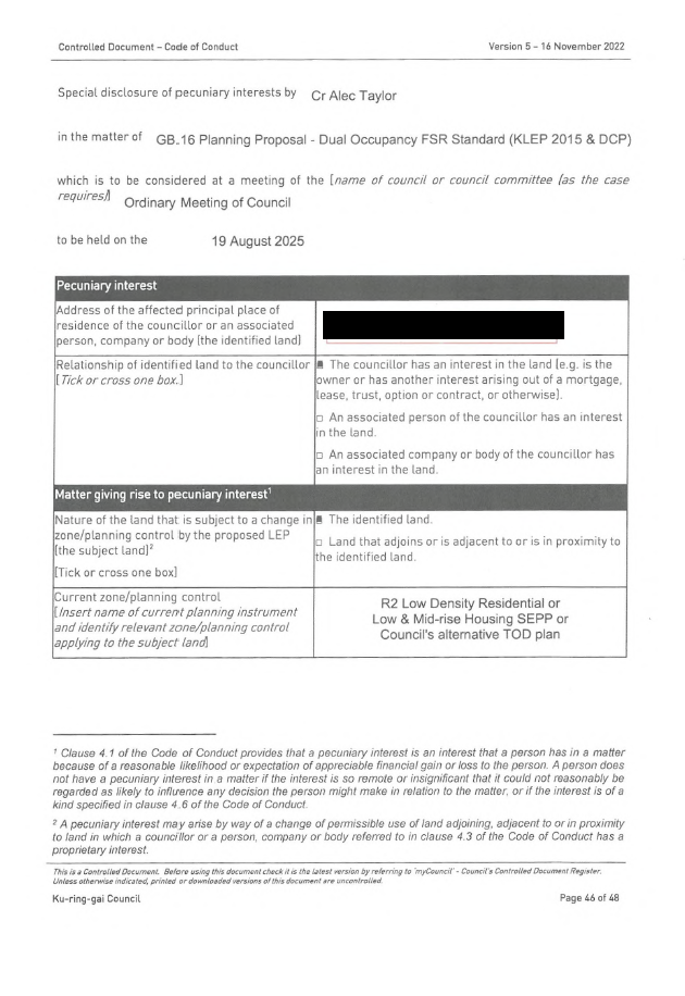 Councillor Taylor declared a special disclosure of pecuniary interest in GB.16 as his principal place of residence may be impacted by the proposed planning controls. Councillor Taylor tabled a special disclosure of pecuniary interest under clause 4.36(c) of the Code of Conduct and will remain in Chambers during this debate.