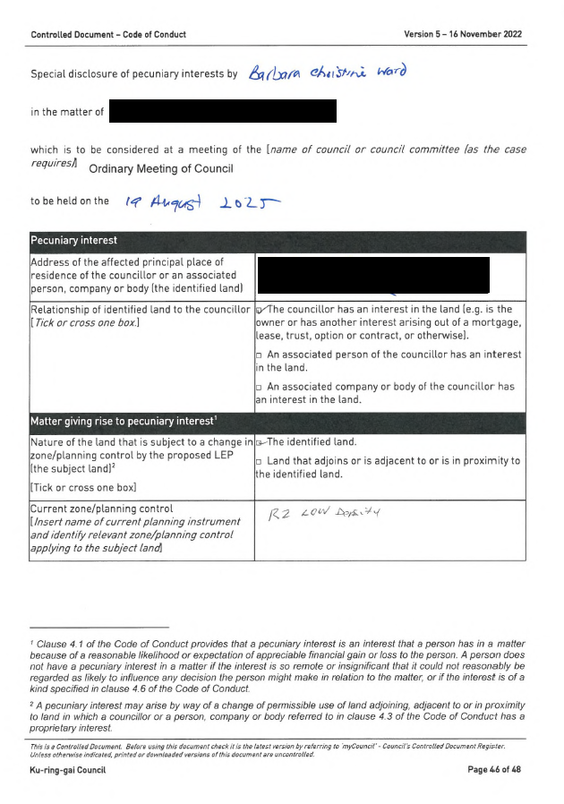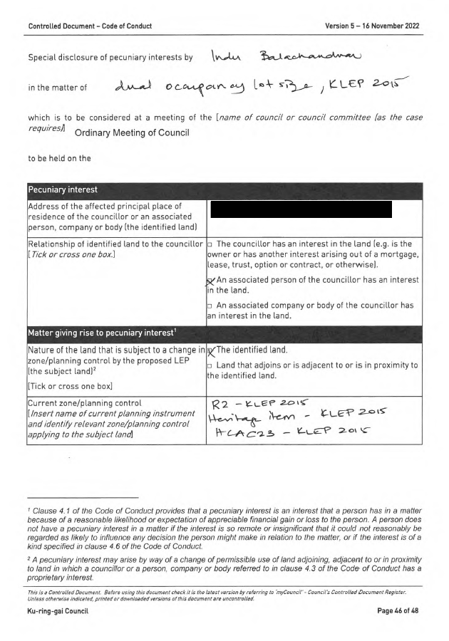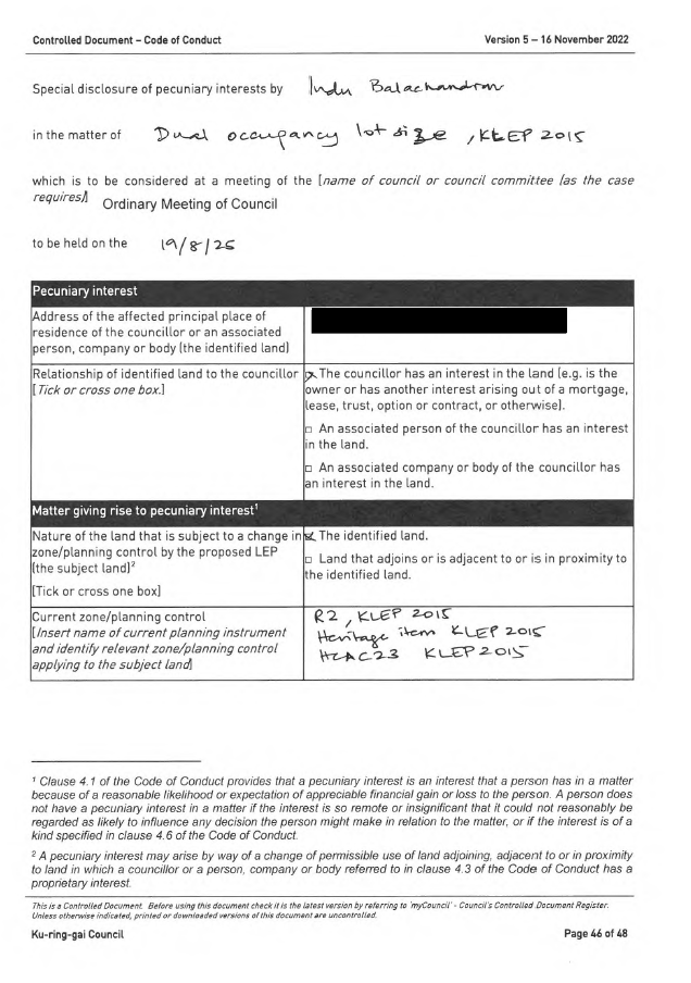 Councillor Balachandran declared a special disclosure of pecuniary interest in GB.16 as both her principal place of residence and her parents principal place of residence may be impacted by the proposed planning controls. Councillor Balachandran tabled a special disclosure of pecuniary interest under clause 4.36(c) of the Code of Conduct and will remain in Chambers during this debate