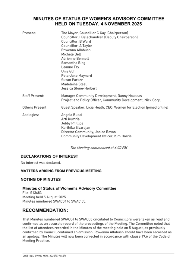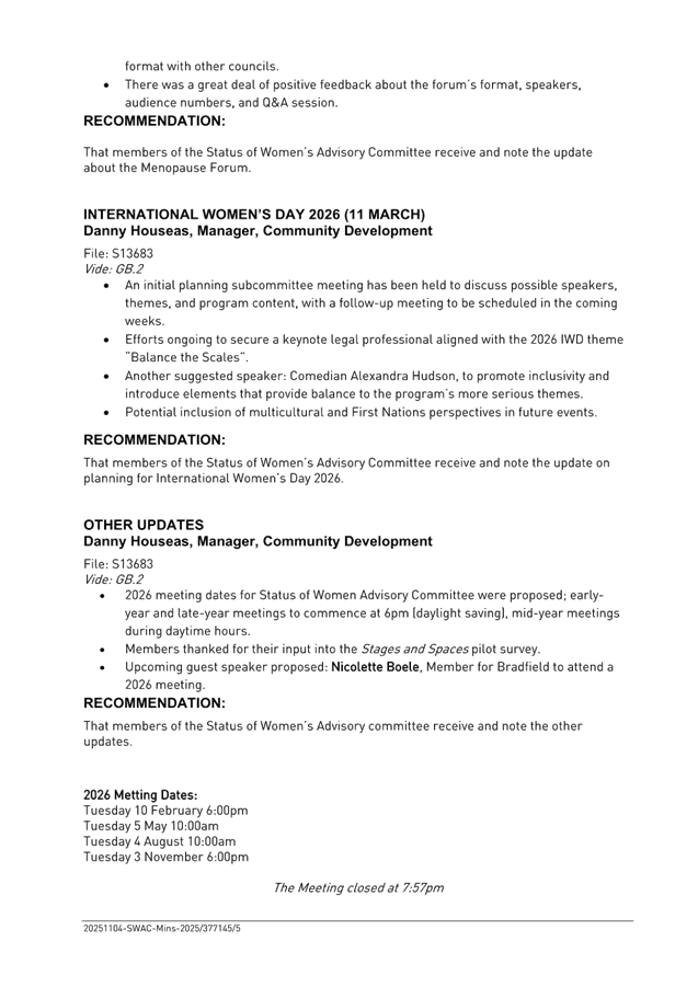 That Council endorse the minutes of the Status of Women’s Advisory Committee meeting held on 4 November 2025.