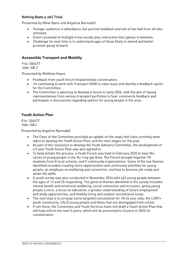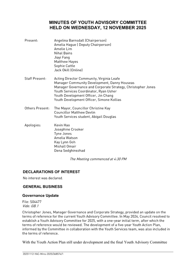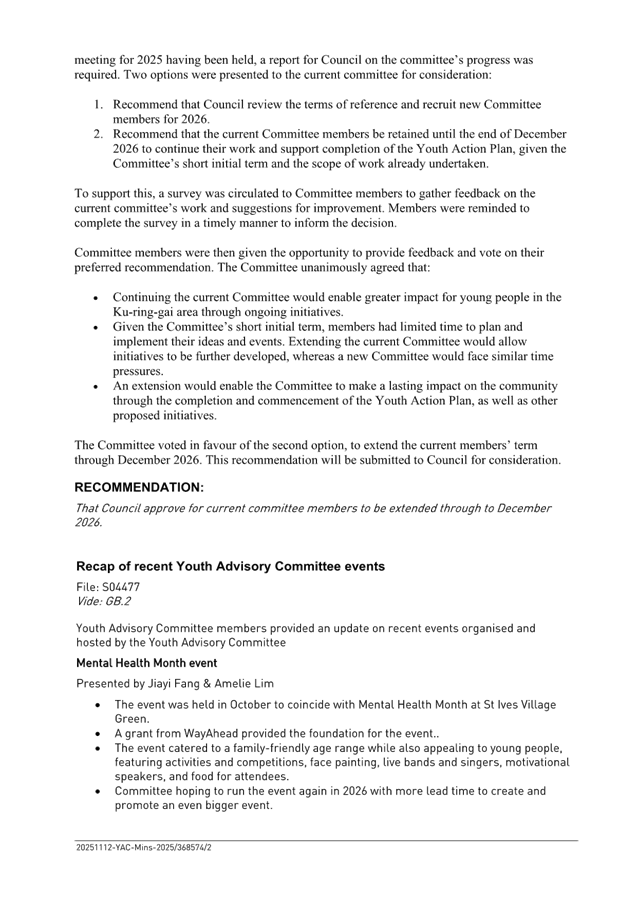 To present the minutes of the Youth Advisory Committee meeting held on 12 November 2025 and seek Council’s consideration of the Committee’s recommendation to extend membership to December 2026.