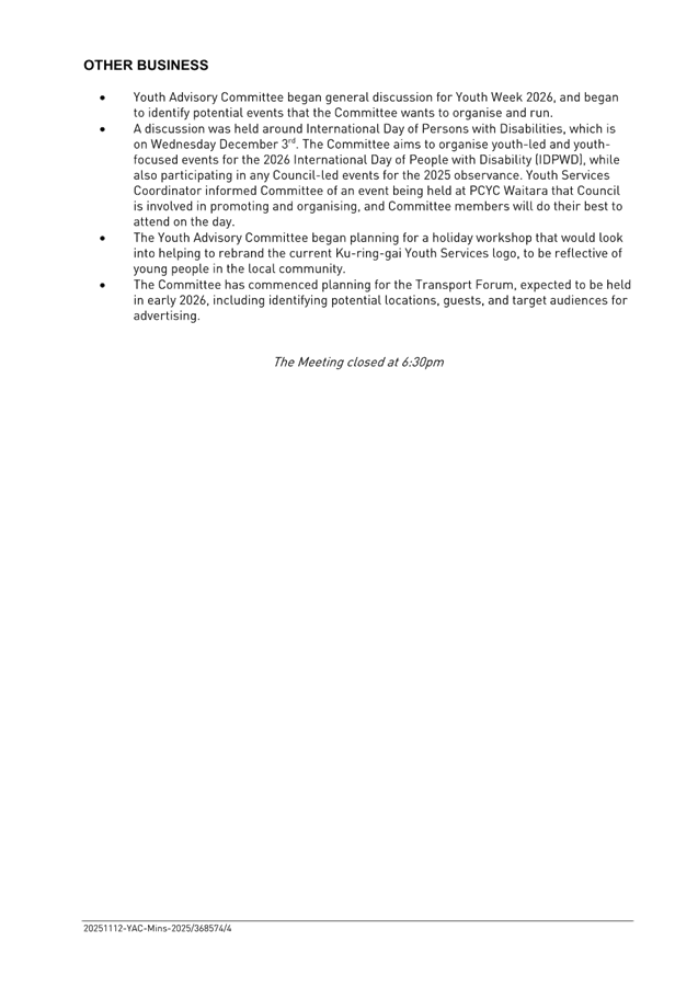 That Council endorses the minutes of the Youth Advisory Committee meeting held on 12 November 2025.