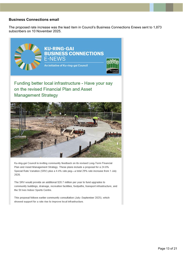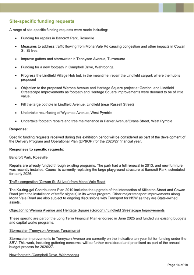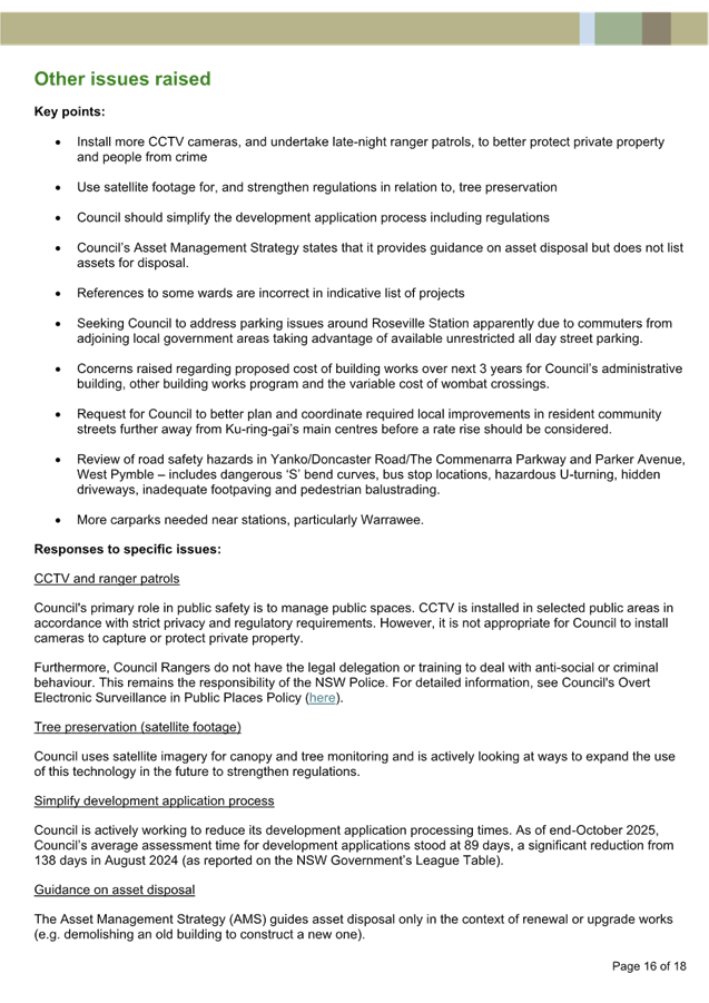 Community consultation (Attachment A1) was undertaken between 30 September 2024 and 27 October 2024 for five proposed EV charging sites by Evie Networks in Ku-ring-gai, including for Coonanbarra Road. The consultation received 161 online survey responses, 17 written submissions, 198 votes on an interactive map and in-person comments gathered through business visits. Four of the five sites exceeded 70% support (including Coonanbarra Road).